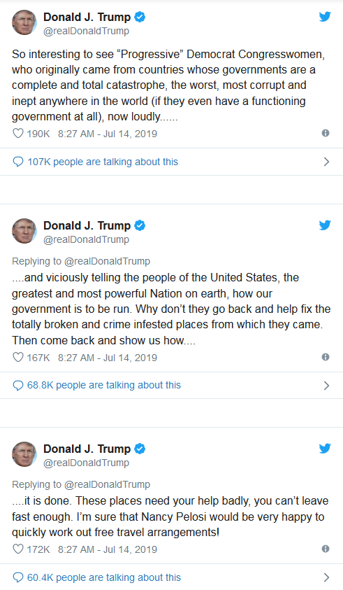 Above are the now deleted tweets from Trump this week where he went on a blatant anti-factual racist rant. Lets break it down a bit.