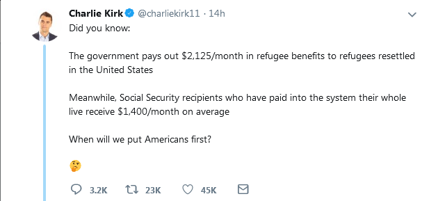 This is a lie, they receive at most 420$ for 8 months per 2 people. And if he is including refugees receiving food stamps, Medicaid and public schooling then you should have no problem with this as immigrants often pay more into taxes than the benefits they receive. Here is an in depth study on exactly this.